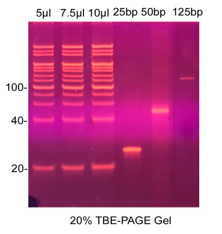 本產品為雙鏈DNA Marker,適用于非變性的PAGE電泳和瓊脂糖凝膠電泳,不適用于尿素PAGE電泳。由于片段較小,建議使用高分辨率瓊脂糖凝膠電泳分離。按照每次上樣5μl計算,該產品可以使用50次。