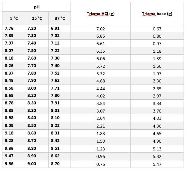 Tris為弱堿,在常溫(25℃)下,它的pKa為8.1,根據(jù)緩沖理論,Tris緩沖液的有效緩沖范圍在pH 7.1到9.1之間。0.1 M的水溶液pH為10.4,一般加入鹽酸以調(diào)節(jié)pH值,即可獲得所需pH值的緩沖液。但同時應注意溫度對于Tris的pKa的影響對于 Tris 緩沖液,溫度每降低 1℃,pH 增加約0.03 個單位,濃度每稀釋 10 倍,pH 降低 0.03-0.05 個單位。對于精確應用,使用帶有玻璃/甘汞復合電極的經(jīng)仔細校正的 pH 計。