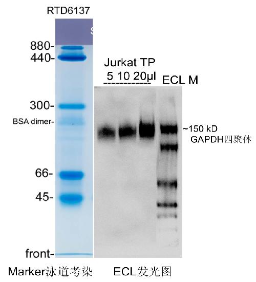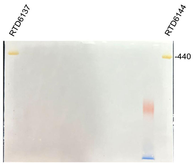 3. 非變性蛋白電泳Marker(RTD6137,RTD6142,RTD6144)由于要保持蛋白的天然結(jié)構(gòu),都沒有偶聯(lián)染料,在電泳時基本都看不到條帶;然而,RTD6137和RTD6144中的440 kD和880 kD由于天然蛋白中含有鐵離子,使得電泳后在膠上可見淡黃色,其中440 kD顏色更深。凝膠轉(zhuǎn)膜后,膜上也可以看到黃色的440 kD條帶(下圖),可以大體判斷Marker轉(zhuǎn)膜的效果。