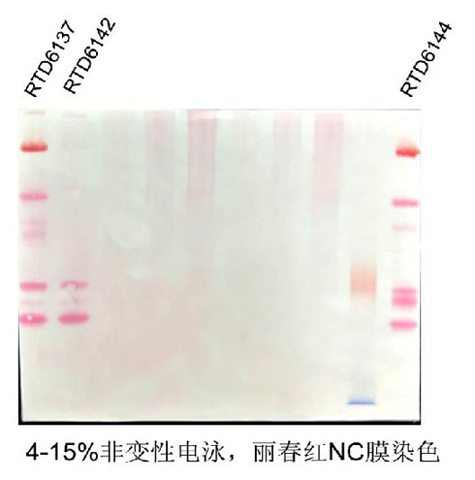 第一種方法:凝膠轉(zhuǎn)膜后用麗春紅染色液(貨號:RTD6301)染膜,可以看到Marker條帶,順便可以檢測轉(zhuǎn)膜效率,然而要注意的是麗春紅染色靈敏度比較低,可能不能完全看到完整的Marker條帶。
