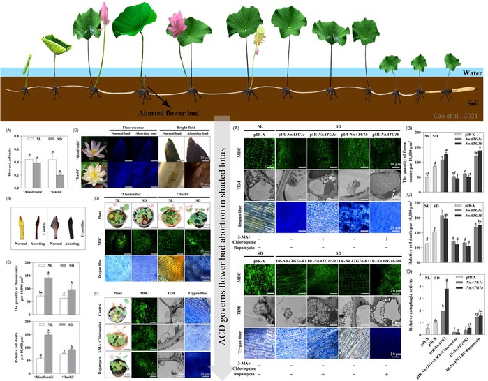 荷花,一種廣泛受歡迎的多年生水生植物,其花芽發育受環境因素如陰雨天和植物間相互遮擋的強烈影響。這些不利條件下的花芽敗育現象,嚴重影響了荷花的觀賞性和經濟價值。該研究團隊通過深入研究發現,在低光照條件下,荷花花芽中的自噬性細胞死亡(ACD)是導致花芽敗育的關鍵因素(圖1)。團隊運用了組織化學染色、熒光顯微鏡和透射電子顯微鏡(TEM)等多種技術,系統地揭示了弱光環境下自噬水平的顯著增加及其導致的細胞死亡現象。