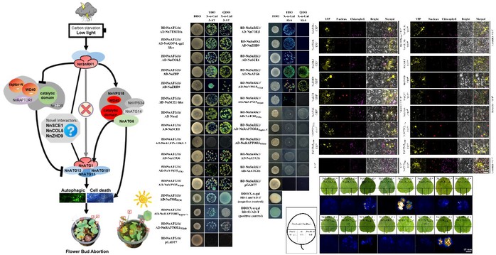 研究團隊還發現了一條至關重要的信號調控途徑,即NnSnRK1-NnATG1信號通路(圖2),這一途徑在荷花逆境下開花的調控中扮演著關鍵角色。通過對自噬相關基因(ATGs)的研究,團隊發現NnSnRK1與NnATG1之間的相互作用,以及其他幾種可能介導此信號調控網絡的中間基因。研究發現通過阻斷這條信號通路,即使在不利環境下,荷花也能更好地開花。這一發現不僅闡明了荷花應對不利生長環境的生物學機制,還展現了植物如何在能量節約和繁殖成功之間找到平衡。