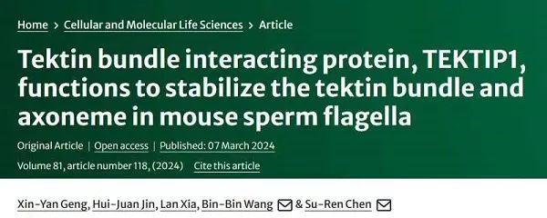精子鞭毛以“9+2”軸絲為核心,環繞著中央2個單體微管的是9個外周二聯體微管(Doublet microtubule, DMT),其中A管為完全微管,B管為不完全微管。DMT中含有多種微管腔內結合蛋白(Microtubule inner protein, MIP),這些蛋白被推測對DMT的穩定性至關重要。哺乳動物精子DMT的特征是其復雜的筑絲蛋白(tektin)束幾乎填滿了整個A管。在哺乳動物中發現了5種不同的tektin(tektin1~5)組成,tektin1~5基因敲除不同程度地影響了小鼠精子運動能力,研究人員還在弱精子癥患者中鑒定到了TEKT3基因突變。