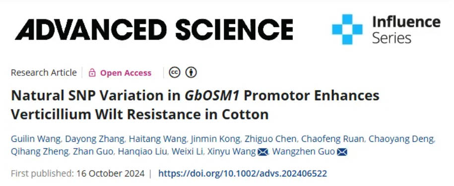 2024年10月16日,南京農業大學郭旺珍及王心宇共同通訊在Advanced Science 在線發表題為“Natural SNP Variation in GbOSM1 Promotor Enhances Verticillium Wilt Resistance in Cotton”的研究論文。王桂林為論文第一作者。