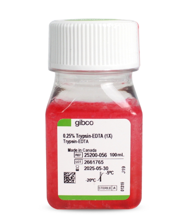 這種胰蛋白酶的液體配方含有EDTA和酚紅。Gibco胰蛋白酶EDTA是由胰蛋白酶粉制成的,胰蛋白酶粉是一種來自豬胰腺的蛋白酶的輻照混合物。由于其消化能力,胰蛋白酶被廣泛用于細胞分離、常規細胞培養傳代和原代組織分離。分離所需的胰蛋白酶濃度隨細胞類型和實驗要求而變化。請參閱Gibco胰蛋白酶溶液的完整范圍和推薦的解離條件。