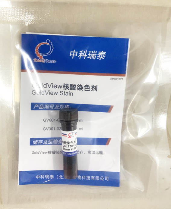GoldView 是一種可代替溴化乙錠(EB)的新型DNA染料,其靈敏度與EB相當,使用方法與之完全相同。在紫外燈下雙鏈DNA呈現綠色熒光。通過小鼠皮下注射實驗,尚未發現GoldView有致癌作用。
