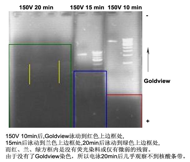 注:預染法,Goldview染色會出現陰陽膠現象,即隨著電泳時間延長,較小的片段會染色不清楚,(參見實驗示例),此時可以將凝膠用后染法染色即可看到小片段條帶。