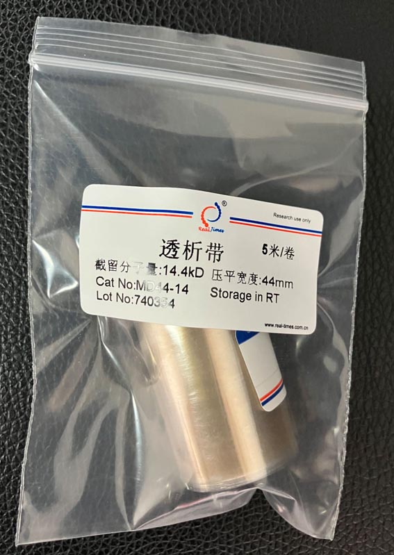 透析膜可用動物膜和玻璃紙等,但用的最多的還是用纖維素制成的透析膜,目前常用的是美國Union Carbide (聯合碳化物公司)和美國光譜醫學公司生產的各種尺寸的透析管,截留分子量MWCO(即留在透析袋內的生物大分子的最小分子量)。截留分子量越大也就是說透過性越大。
