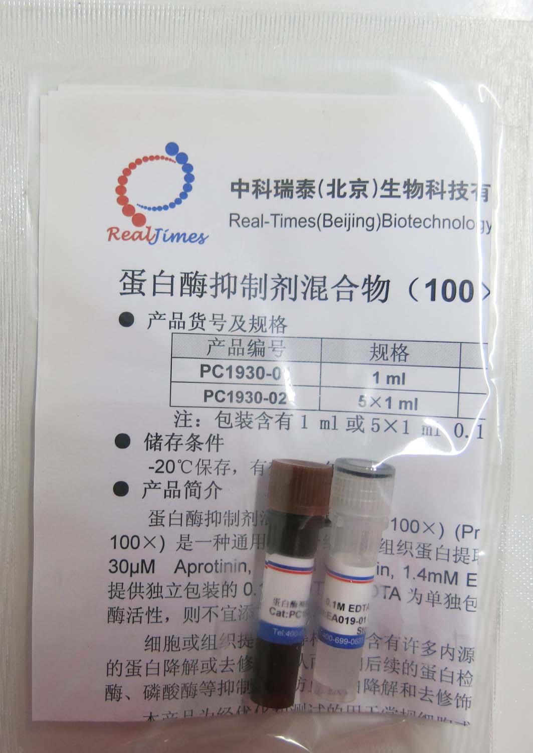 本蛋白酶抑制劑混合物為100×的儲存液,使用時按照1:100的比例加入到裂解液中(例如,1ml裂解液中加入10μl蛋白酶抑制劑混合物),混勻后即可使用。含有蛋白酶抑制劑混合物的裂解液宜現用現配,不宜配制后凍存待后續使用。根據需要,0.1M的EDTA也按照1:100的比例加入到裂解液中。
