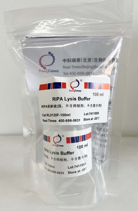 Buffer)是一種傳統(tǒng)的細胞組織快速裂解液。RIPA裂解液裂解得到的蛋白樣品可以用于常規(guī)的Western、IP等。RIPA的本意是Radio Immunoprecipitation Assay。RIPA裂解液的配方有很多種,根據(jù)其裂解液的強度大致可以分為強、中、弱三類。該RIPA裂解液(強)的主要成分為50 mM Tris (pH 7.4),150 mM NaCl,1% Triton