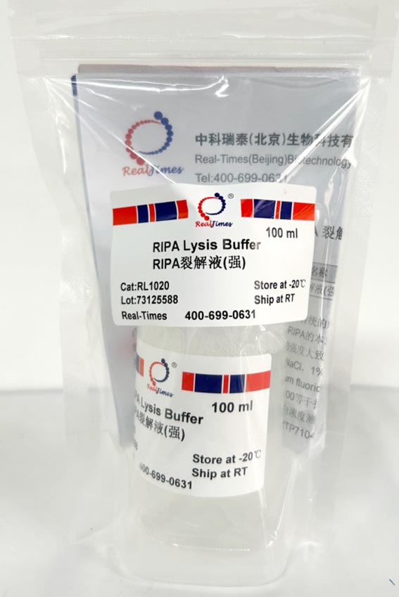 Lysis Buffer)是一種傳統的細胞組織快速裂解液。RIPA裂解液裂解得到的蛋白樣品可以用于常規的Western、IP等。RIPA的本意是Radio Immunoprecipitation Assay。RIPA裂解液的配方有很多種,根據其裂解液的強度大致可以分為強、中、弱三類。RIPA裂解液(強)的主要成分為50 mM Tris (pH 7.4),150 mM NaCl,1% Triton