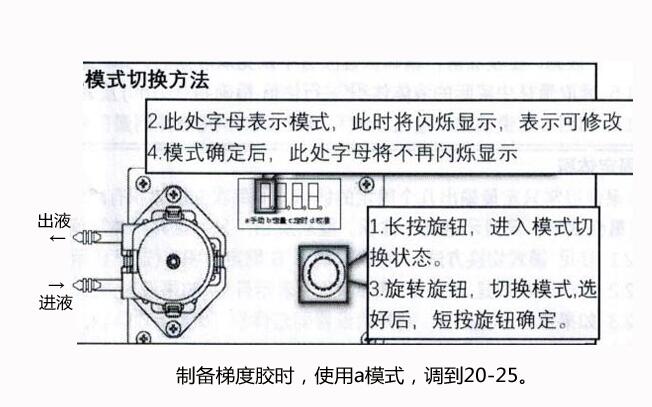 檢查無誤后,打開蠕動泵,使用a模式,調節數字為25,開始灌膠操作。至多板制膠器中的溶液至頂部接近溢出時,首先關閉多板制膠器藍色閥門(旋鈕與硅膠管垂直為關閉);