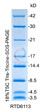 本產品包含8種低分子量蛋白質,分子量范圍為3.5-42 kD,通過 Tris-Tricine-SDS-PAGE電泳并經考馬斯亮藍染色后可見分子量大小為3.5,4.5,8.5,14.4,17,21,30,42