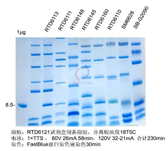 (含預染Marker)(貨號:RTD6121)或Tris-Tricine-PAGE凝膠制備及電泳試劑盒(多肽變性電泳)(貨號:RTD6122)進行Tricine電泳,方便快捷。或者根據以下程序制備凝膠,先配制分離膠,聚合后再配制夾層膠,最后配制濃縮膠,3種膠的制膠體積比約為4.5:1.5:1.5。