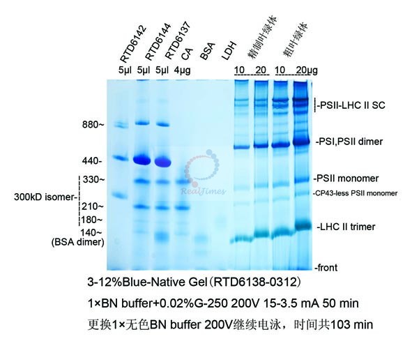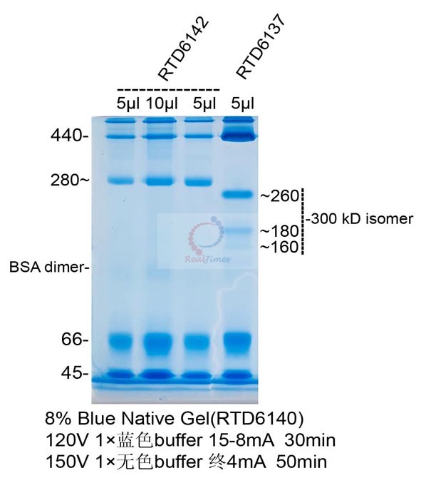 2. 該產品不含蛋白凝膠制備試劑,您可以選擇非變性PAGE凝膠制備及電泳試劑盒(貨號:RTD6130)或者蛋白預制膠(貨號RTD6118)。如自備試劑,經典Laemmli系統中把制膠溶液、電泳緩沖液和上樣緩沖液中的SDS和還原劑(DTT或β-巰基乙醇)全部去除即可進行非變性電泳。