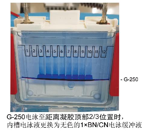 BN-PAGE電泳外槽使用1×BN/CN電泳緩沖液;內槽開始電泳使用的是1×藍色陰極緩沖液,冰浴電泳,等待電泳指示前沿到達距離凝膠頂部2/3處時,將電泳緩沖液更換為1×BN/CN電泳緩沖液,繼續后續電泳,因為過多染料會影響蛋白在凝膠中的遷移以及蛋白后續的轉膜實驗。