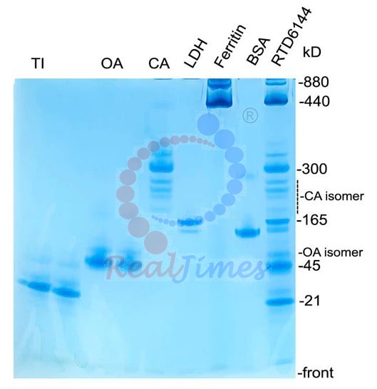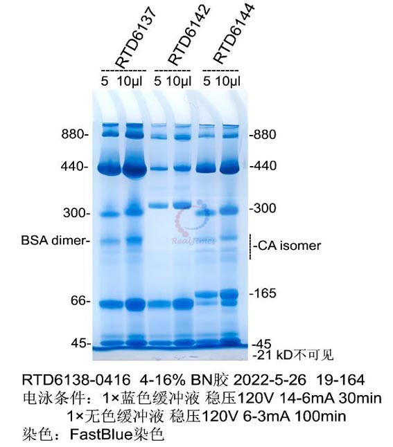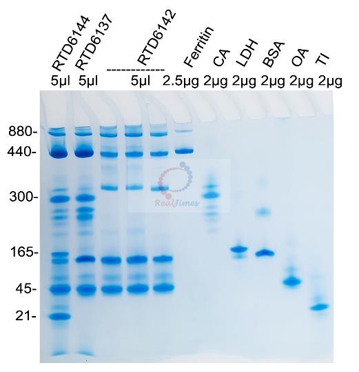 2. 該產品不含蛋白凝膠制備試劑,您可以選擇非變性PAGE凝膠制備及電泳試劑盒(貨號:RTD6130)或者蛋白預制膠(貨號RTD6118)。如自備試劑,經典Laemmli系統(tǒng)中把制膠溶液、電泳緩沖液和上樣緩沖液中的SDS和還原劑(DTT或β-巰基乙醇)全部去除即可進行非變性電泳。