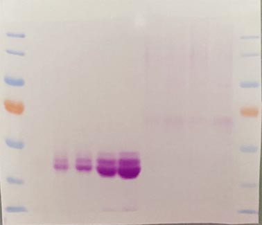 凝膠中加入25 ml糖蛋白染色試劑,搖床慢搖15 分鐘,糖蛋白會在5-10分鐘內顯現品紅色。若檢測的糖蛋白含量較低,適當延長顯色時間。棄染色溶液。