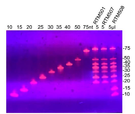 lane 1-9 為10,15,20,25,30,35,40,50,75 nt ssDNA 上樣量為0.5