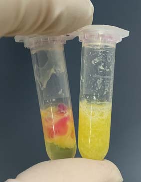 左側未完全混勻,有紅色;右側完全混勻,呈均勻黃色