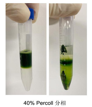 在另一15 ml離心管加入4.8 ml 1×葉綠體提取緩沖液(即用型)和3.2 ml 密度梯度分離試劑,充分混合均勻,得40%密度梯度輕液。