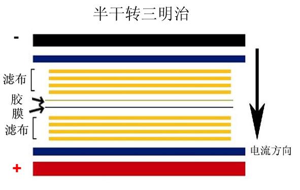 1. 將濾布折疊成10×10 cm大小(四層),鑷子夾取折疊好的濾布在轉(zhuǎn)膜緩沖液中浸濕3-5分鐘,按照下圖制作轉(zhuǎn)印三明治,正負(fù)極各放置一張折疊好的濾布。