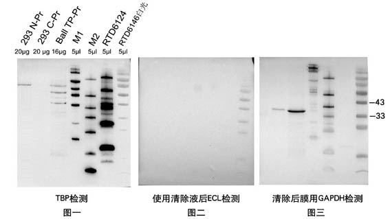 1. 在完成Western化學發光檢測后,NC膜或PVDF膜用適量蒸餾水中震蕩漂洗5分鐘;重復漂洗2次;1×TBST漂洗一次。