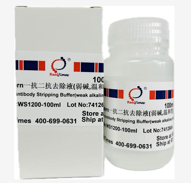 Western一抗二抗去除液(弱堿,溫和型)(Western Antibody Stripping Buffer,weak alkaline,mild type)可以高效去除印跡膜上的一抗和二抗,而吸附在膜上的抗原基本不受影響,用于Western中轉移了蛋白膜的重復利用,可以轉一次膜,做多次Western印跡實驗,通常可以重復利用膜5-8次(PVDF膜)。使用本試劑只需大約30分鐘即可實現蛋白膜的重復使用,然后可以進行Western的后續操作。