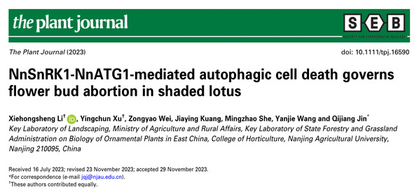 近日,園藝學院徐迎春教授團隊在國際知名期刊《The Plant Journal》上發表了題為“NnSnRK1-NnATG1-mediated autophagic cell death governs flower bud abortion in shaded lotus”的論文。該研究揭示了自噬在植物繁殖過程中的重要調控作用,特別是在能量限制條件下,通過自噬調節開花過程,以提高植物的繁殖效率和能量利用效率,為理解植物如何在逆境下調整其生殖策略提供了新的視角。