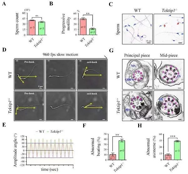 陳蘇仁課題組利用CRISPR/Cas9基因編輯技術構建了Tektip1基因敲除小鼠,敲除鼠生長發育正常但雄性生育力顯著降低,主要表現為一定程度的精子軸絲結構破壞和精子運動軌跡改變(圖1)。