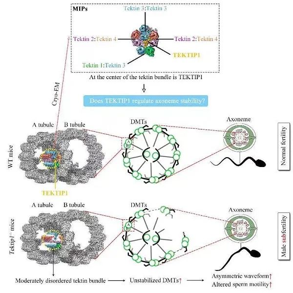 精子鞭毛以“9+2”軸絲為核心,環繞著中央2個單體微管的是9個外周二聯體微管(Doublet microtubule, DMT),其中A管為完全微管,B管為不完全微管。DMT中含有多種微管腔內結合蛋白(Microtubule inner protein, MIP),這些蛋白被推測對DMT的穩定性至關重要。哺乳動物精子DMT的特征是其復雜的筑絲蛋白(tektin)束幾乎填滿了整個A管。在哺乳動物中發現了5種不同的tektin(tektin1~5)組成,tektin1~5基因敲除不同程度地影響了小鼠精子運動能力,研究人員還在弱精子癥患者中鑒定到了TEKT3基因突變。