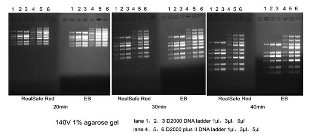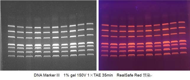 RealSafe Red?是一種可以替代溴化乙錠(EB)的紅色熒光核酸染色劑,與GelRed是類似產品。與SYBR或EB相比,RealSafe Red最顯著的特性是其在多種條件下的高靈敏性和穩定性。另外相對EB或SYBR,RealSafe Red誘導突變的能力極低。