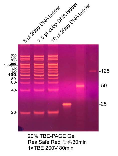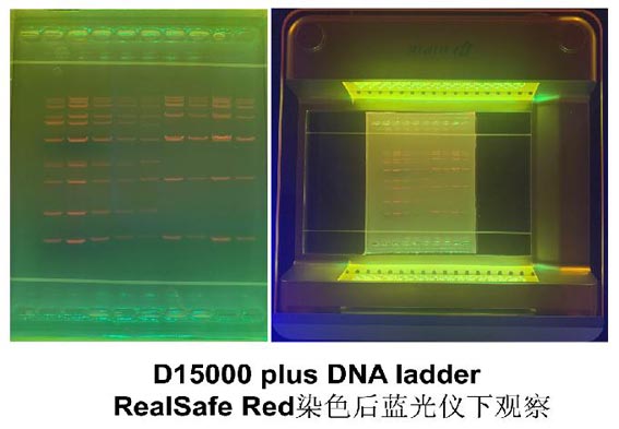 2.1 用制備凝膠電泳對應的1×電泳緩沖液將RealSafe Red稀釋約5000倍,制成即用型染色溶液。(例如:將20 μl RealSafe Red加入到100 ml 緩沖液中)。