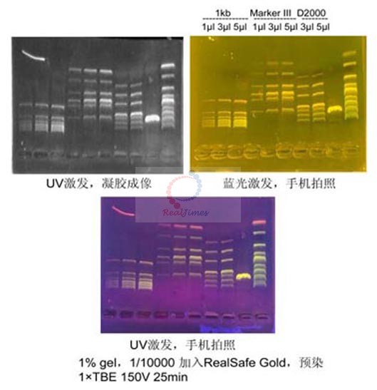 將RealSafe Gold試劑按1:10000溶于瓊脂糖凝膠溶液中,充分混勻。(例如:將5 μl RealSafe Gold 試劑加入到50 ml 凝膠溶液中)。注:由于RealSafe Gold 具有出色的熱穩(wěn)定性,可將試劑直接加入高溫的凝膠溶液中,而不用等凝膠溶液冷卻后再加入。