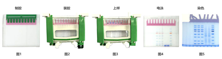 PAGE上層膠紅色染料用于PAGE上層膠配制和電泳的效果圖。圖1和圖2為使用PAGE上層膠紅色染料配制的上層膠被染成紅色,上樣孔一目了然,易于判斷上樣孔是否歪曲或破損;圖3是上樣后的效果圖,上層膠和樣品非常清晰;圖4為預染蛋白分子量Marker電泳后的效果,染料保留在上層膠中,不會隨著電泳而遷移;圖5為凝膠染色后的效果,樣品分離清晰,泳道無豎條拖尾,染料不影響電泳結果。