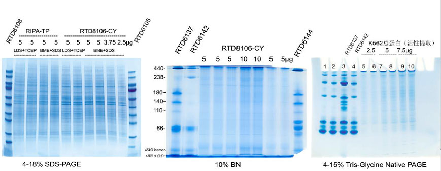 使用該產(chǎn)品提取的蛋白可以用于普通非變性電泳(Laemmli系統(tǒng))(貨號(hào):RTD6130,RTD6135)或Blue