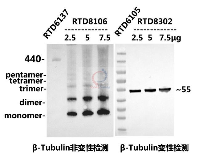 5 一抗:β-Tubulin 1:5000(RGT2130)RT 60min;二抗-羊抗鼠IgG-HRP 1:5000(HGM1060) RT 60min