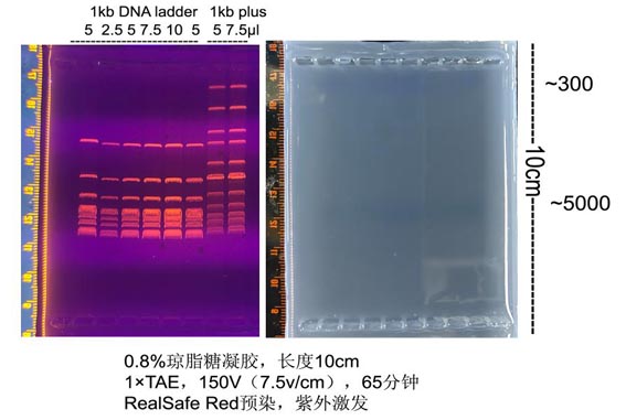 4. 推薦使用RealSafe系列染料(貨號:GR002,GR003,GR004)染色。如果使用Goldview或EB等染料進行染色,由于此類染料帶更多的正電荷(染料移動方向與核酸泳動方向相反),隨著電泳時間延長,染料向大片段聚集,凝膠會出現陰陽膠現象(染料含量高的凝膠紫外下較亮,含量低的凝膠紫外下發暗),導致小分子量DNA顯色很弱或不可見。陰陽膠可以在電泳結束后浸泡染色,將膠浸沒在含1 μg /ml EB或Goldview的電泳緩沖液中20-25 min,小分子量DNA會顯色清楚。更長時間浸泡會因DNA分子擴散而使條帶彌散,小分子量DNA更易彌散。