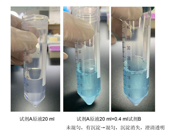 如,取50ml 試劑A與1ml試劑B混合,配成51 ml BCA工作液。兩者混合時會有沉淀形成,徹底混勻后沉淀消失,溶液應為澄清淡藍色溶液。